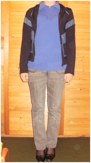 Ugye nem haragszol meg, ha azt mondjuk, hogy sokkal többet kihozhatnál magadból?:)Nézzük akkor e kék pulcsit a kardigánnal (vagy melegítő fölső?!). A leveledben azt írtad, 64 centi a derekad átmérője? Akkor hol rejtegeted? :) Ezzel a pulcsival nem 50 kilósnak, hanem legalább 60-nak tűnsz! Vagy direkt el akarod titkolni, hogy szép alakod van? :) A színek is sajnos elég egyhangúak. Ha nem szereted az élénk színeket, akkor a kiegészítőidbe csempéssz egy kis életet, és sokkal vidámabb lesz a szerelésed! :)